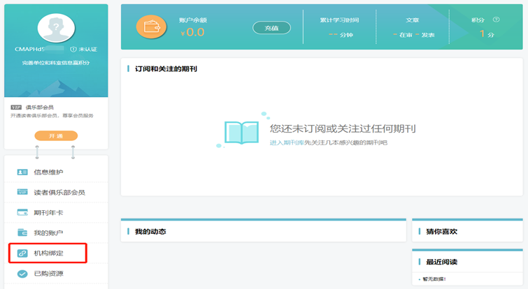 进入个人中心,点击左侧菜单栏中“机构绑定”