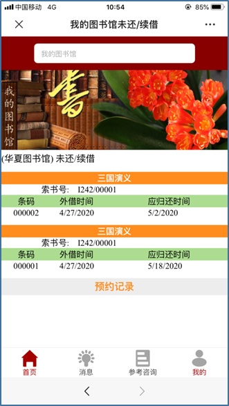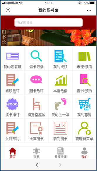 读者可通过微信服务平台实现对本馆馆藏实现预约、续借、个人借还记录查询、个人密码修改;查询读者排行榜、提供阅读测评功能;响应读者荐购、与图书馆进行平台信息交流,具备向读者实时自动推送借还书清单、借书超期催还清单提醒。