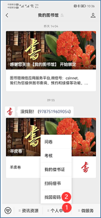 1、打开微信,(图 1)点击微信界面右上方“ +”号→添加新朋友→输入 “ CSLNNET”关注 “我的图书馆”;(图 2)或是扫描下方二维码进行关注;