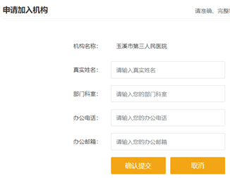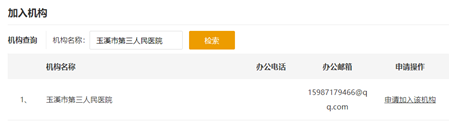 1. 在搜索框中輸入 “貴陽市婦幼保健院”,點擊搜索後申請加入該機構,完善信息(辦公電話可填寫自己手機號,辦公郵箱可填寫 qq郵箱),加入機構,審核中。萬方工作人員會關註後颱申請人員,及時通過。